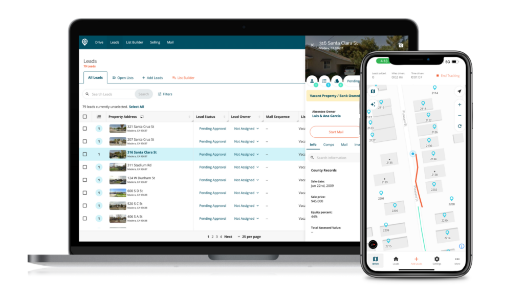 DealMachine is a mobile-first real estate platform designed for “driving for dollars.” Investors use it to identify potential deals while physically scouting neighborhoods. With its intuitive mobile interface, users can capture property data, owner details, and initiate direct mail campaigns all from a smartphone.